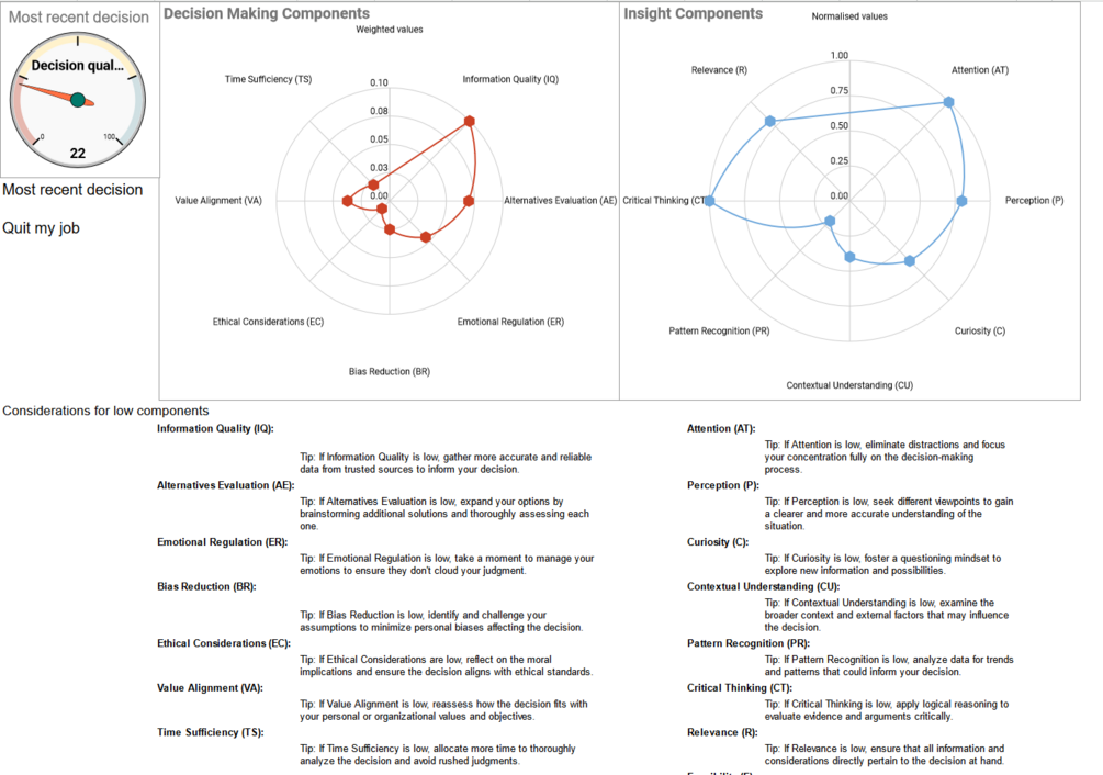 • Assess decisions based on Main Components (e.g., Information Quality, Alternatives Evaluation, Ethical Considerations) and Insight Sub-components (e.g., Attention, Critical Thinking, Impact).